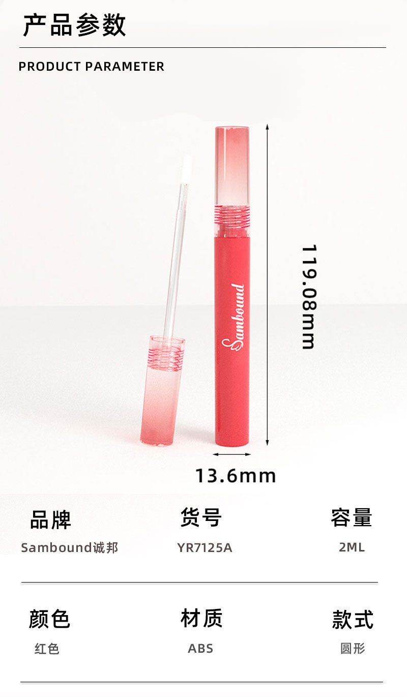 產(chǎn)品名稱唇彩包材產(chǎn)品貨號YR7125容量2ML顏色紅色-可定制材質(zhì)ABS重量32 9g制做工藝注塑包裝方式單個OPP袋裝再用紙箱