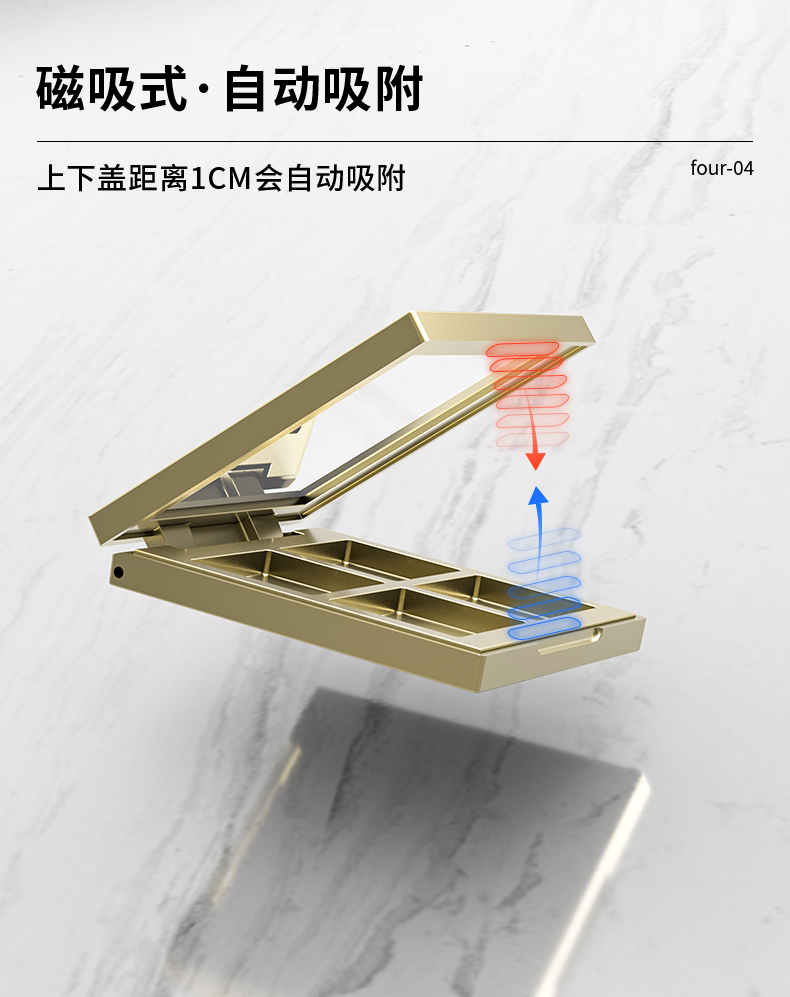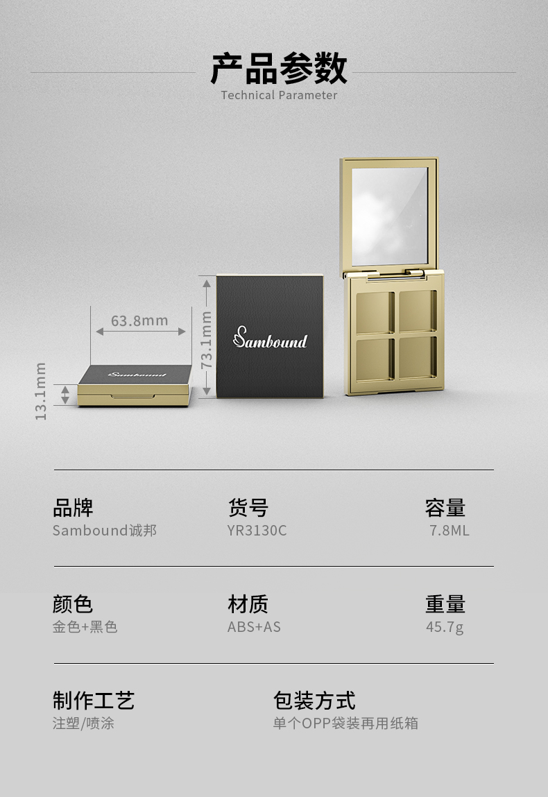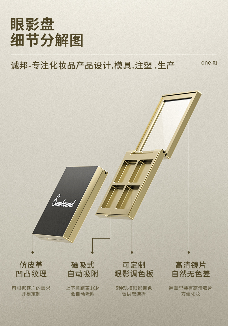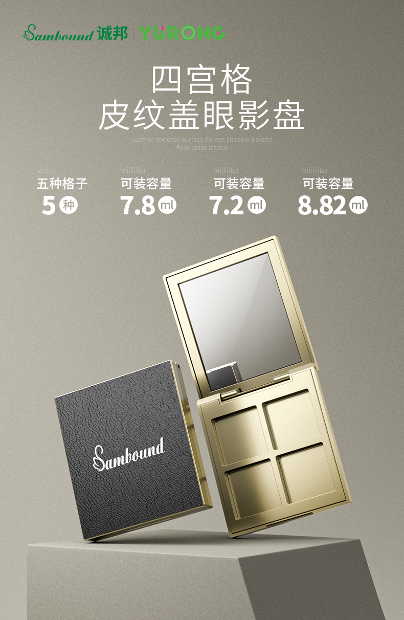 定制四格皮紋蓋眼影盤空盒包裝表面采用皮紋蓋,內(nèi)部金色電鍍更顯奢華。
