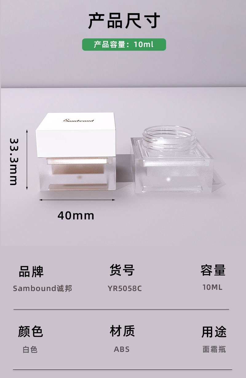 產(chǎn)品名稱面霜包材產(chǎn)品貨號(hào)YR5058C容量10ML顏色白色-可定制材質(zhì)ABS重量32 9g制做工藝注塑包裝方式單個(gè)OPP袋裝再用紙箱