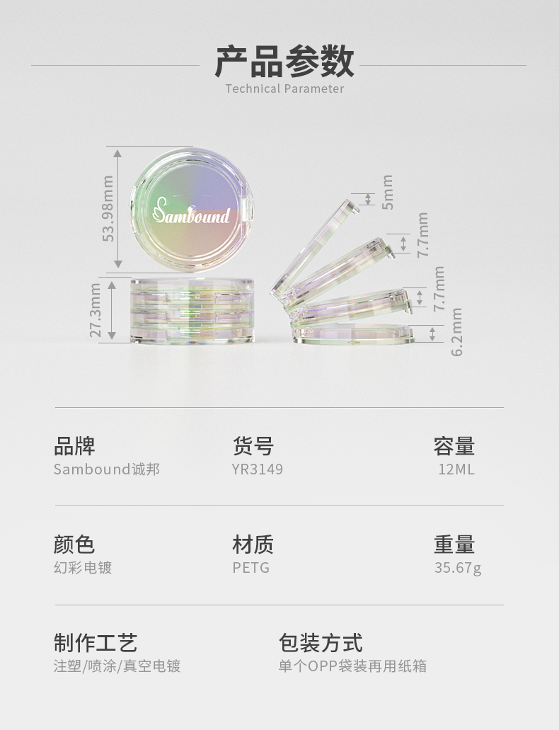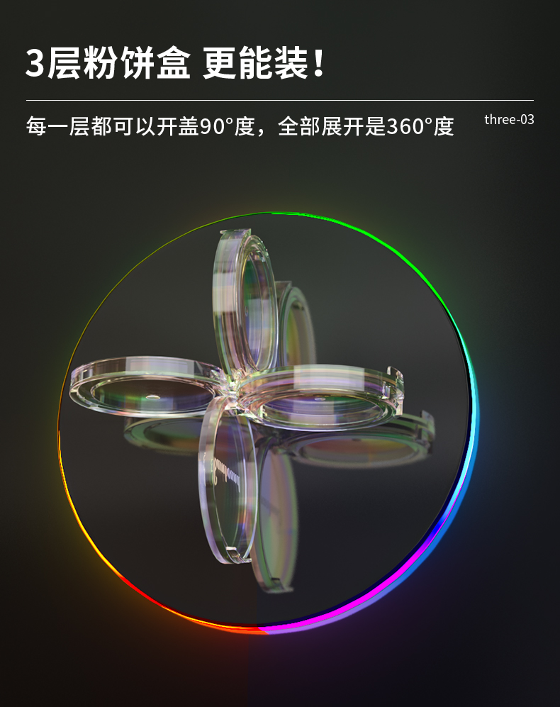 三層透明空粉餅盒化妝品包材廠家,該產(chǎn)品特點(diǎn):可以電鍍炫彩,也可以根據(jù)客戶需求定制透明或者其他顏色,產(chǎn)品的層數(shù)可以疊加。