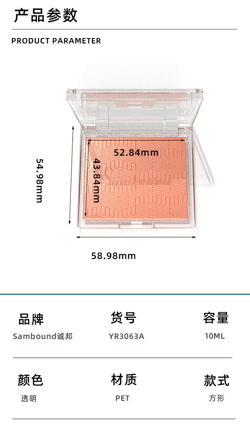 產(chǎn)品名稱修容盒包材產(chǎn)品貨號YR3163a容量10ML顏色透明-可定制材質(zhì)PET重量32 9g制做工藝注塑包裝方式單個OPP袋裝再用紙箱